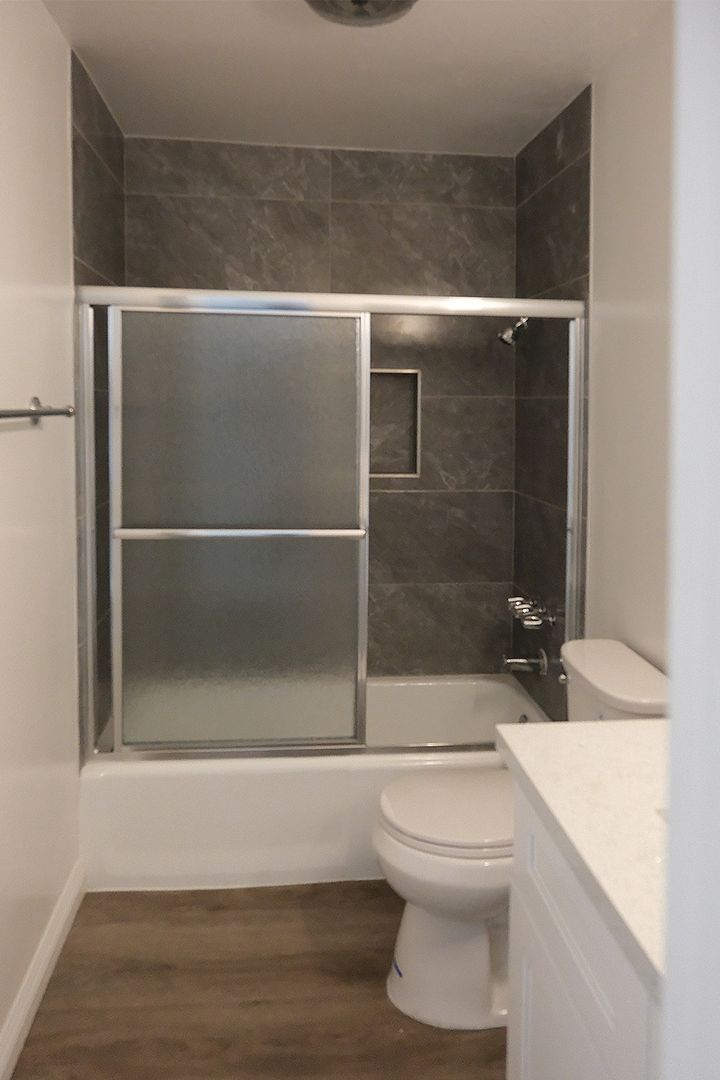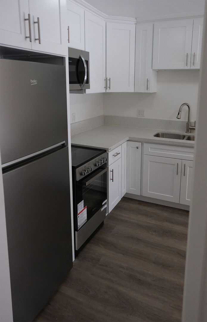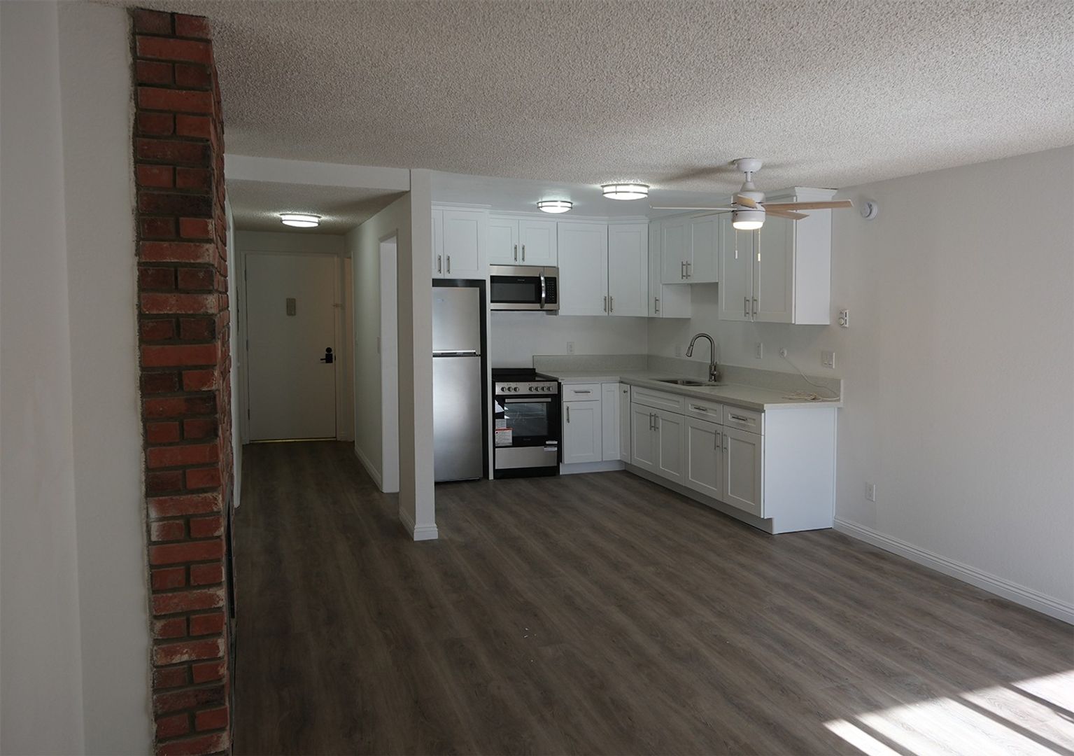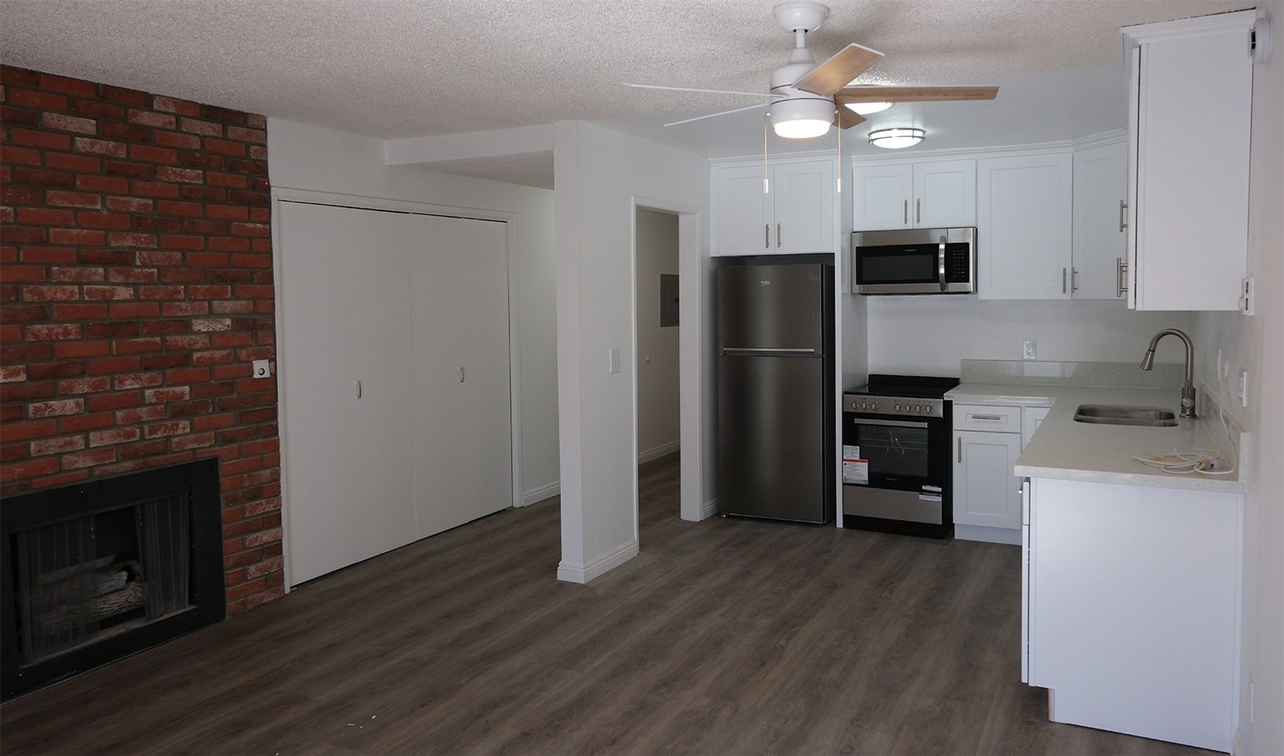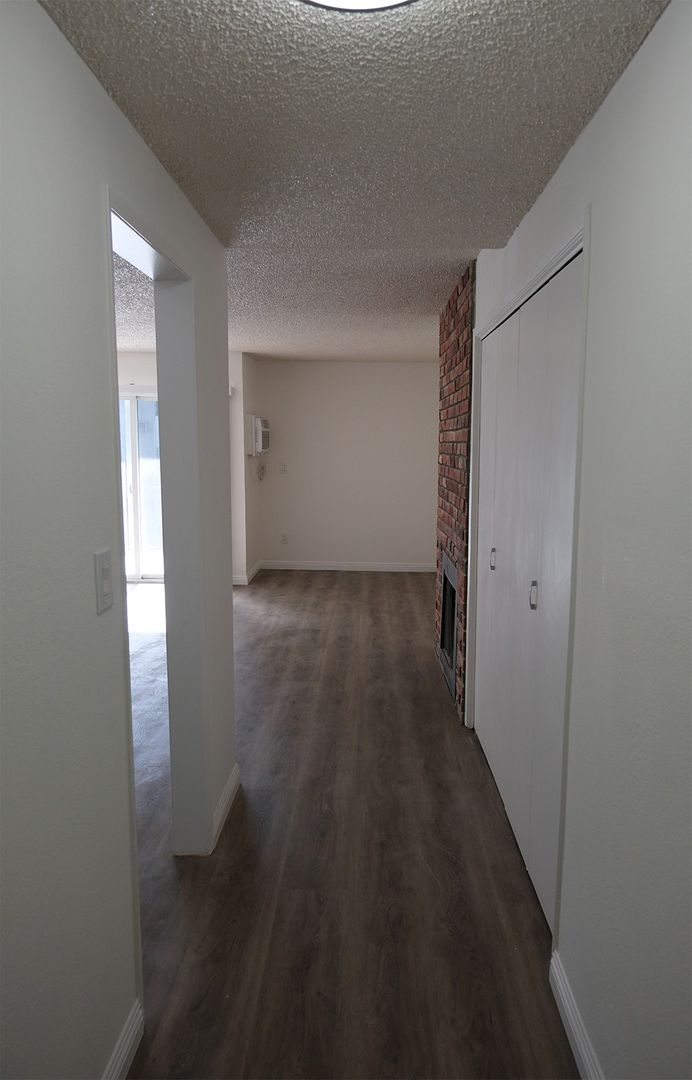 Full kitchen with refrigerator, stove, microwave, and garbage disposal, full bath with shower, shower doors and tub. Vinyl plank flooring. One assigned parking space in a shared gated garage, and a storage locker in the garage. We pay for water, sewer, and gas utilities for the fireplace (in units with a fireplace). Stoves and heat are electric. Tenant pays for electricity and communications (internet, TV, phone, etc). Our building has Spectrum (in most units), AT&T-Uverse, and Starry Internet available.