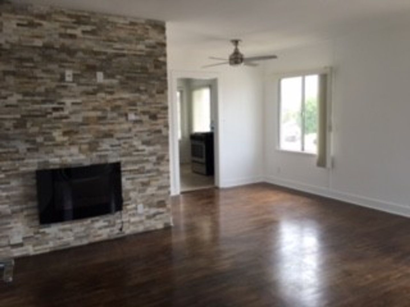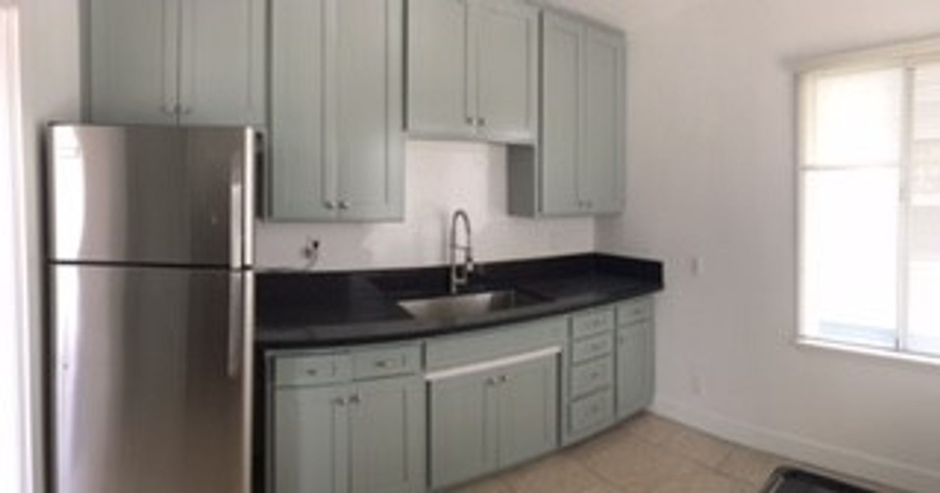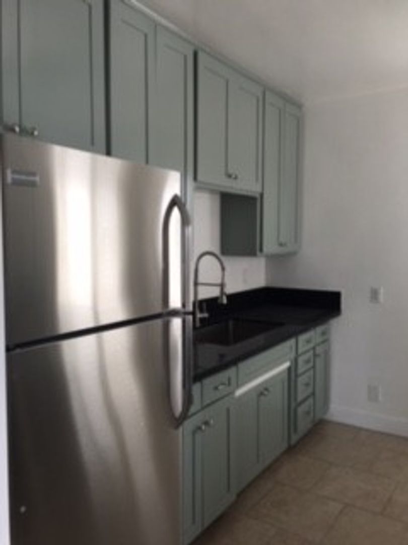 BEAUTIFUL UPPER 1 BEDROOM UNIT IN MAR VISTA NEAR CENTINELA WITH BLACK GRANITE COUNTERTOP IN KITCHEN AND STAINLESS STEEL APPLIANCES (STOVE, REFRIGERATOR), CUSTOM GREEN COLOR CABINETRY IN KITCHEN AND HALLWAY, ELECTRIC FIREPLACE IN LIVING ROOM OVER A FAUX TILED DECORATIVE ACCENT WALL.