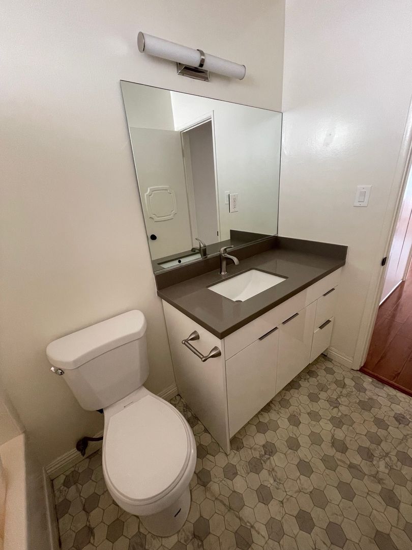 SINGLE LOWER UNIT IN PALMS WITH UPGRADED QUARTZ COUNTERS AND FAUX WOOD FLOORS, WITH AN UPGRADED BATHROOM. OTHER UNIT AMENITIES INCLUDE A CEILING FAN, VERTICALS, AND STAINLESS REFRIGERATOR /STOVE. THE GATED BUILDING HAS LAUNDRY ROOM ON SITE AND A POOL. STREET PARKING ONLY