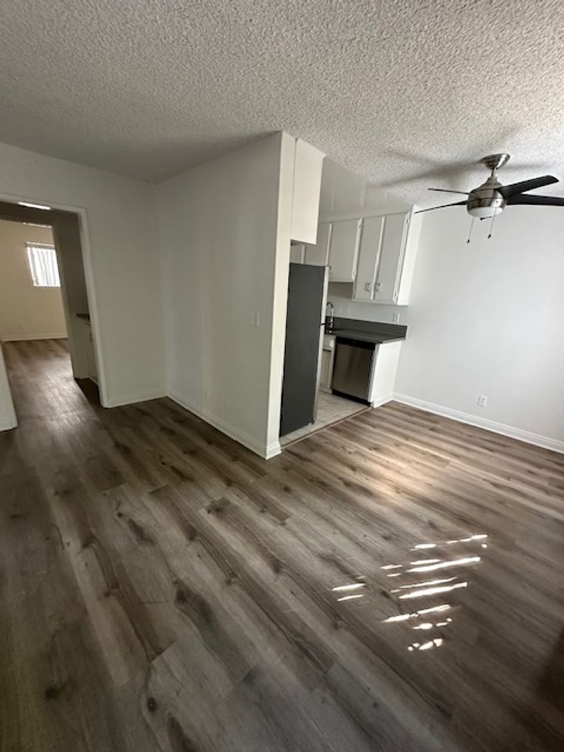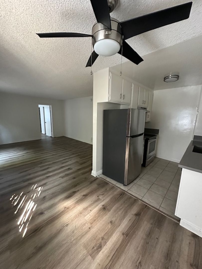 Welcome to the Beautifully Upgraded two-bedroom unit, located in the Palms Neighborhood, a prime location with coffee shops just around the corner, near Sony Studios, and Amazon Offices. The living room is open and inviting, include beautiful wood-like flooring throughout. The modern kitchen, featuring new quartz counters, a stove, refrigerator, complete with a new quartz vanity. . The living room is open and inviting, perfect for entertaining or simply relaxing after a long day. The apartment also comes with a ceiling fan and air conditioner. For your convenience, there is onsite laundry available. The unit also includes vertical window coverings. Outside, you'll find a large size patio, perfect for enjoying the California sunshine. A tandem parking space, suitable for two compact cars. Experience the best of Los Angeles living in this beautifully upgraded unit.