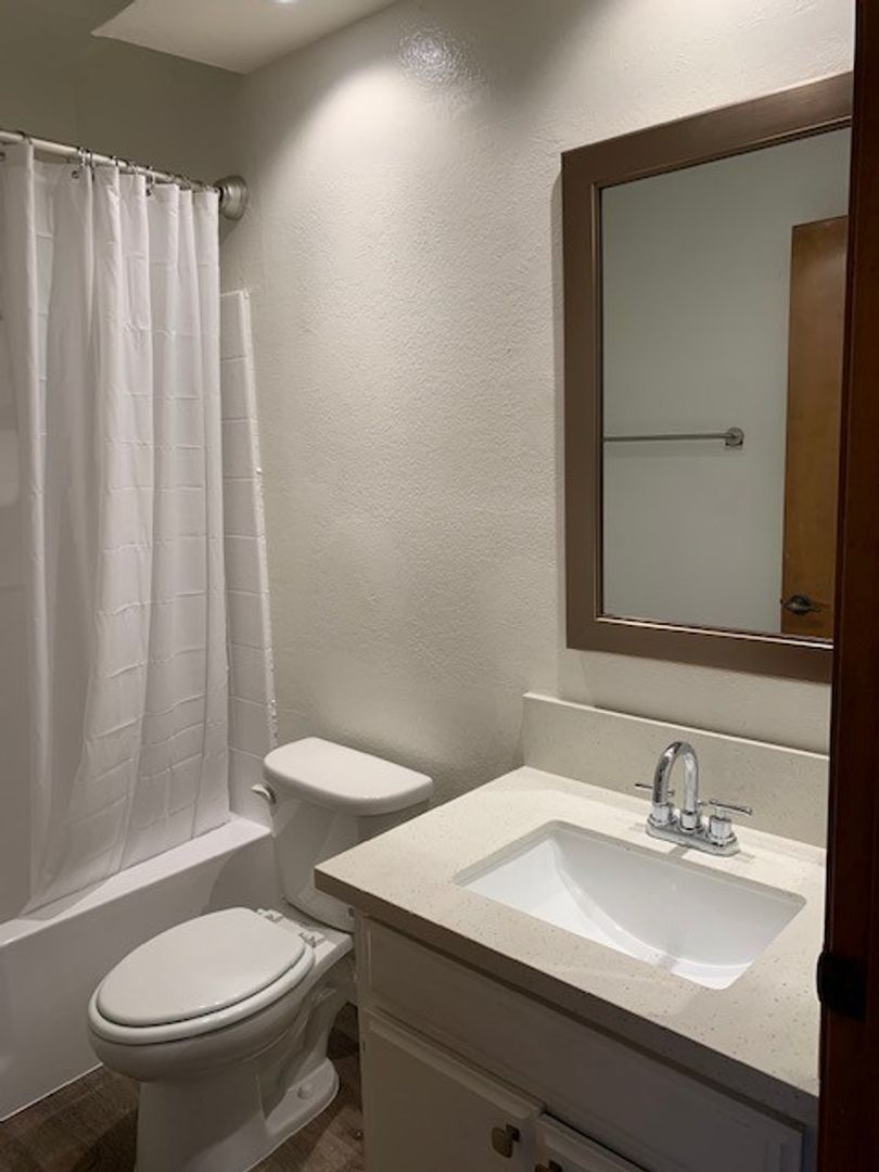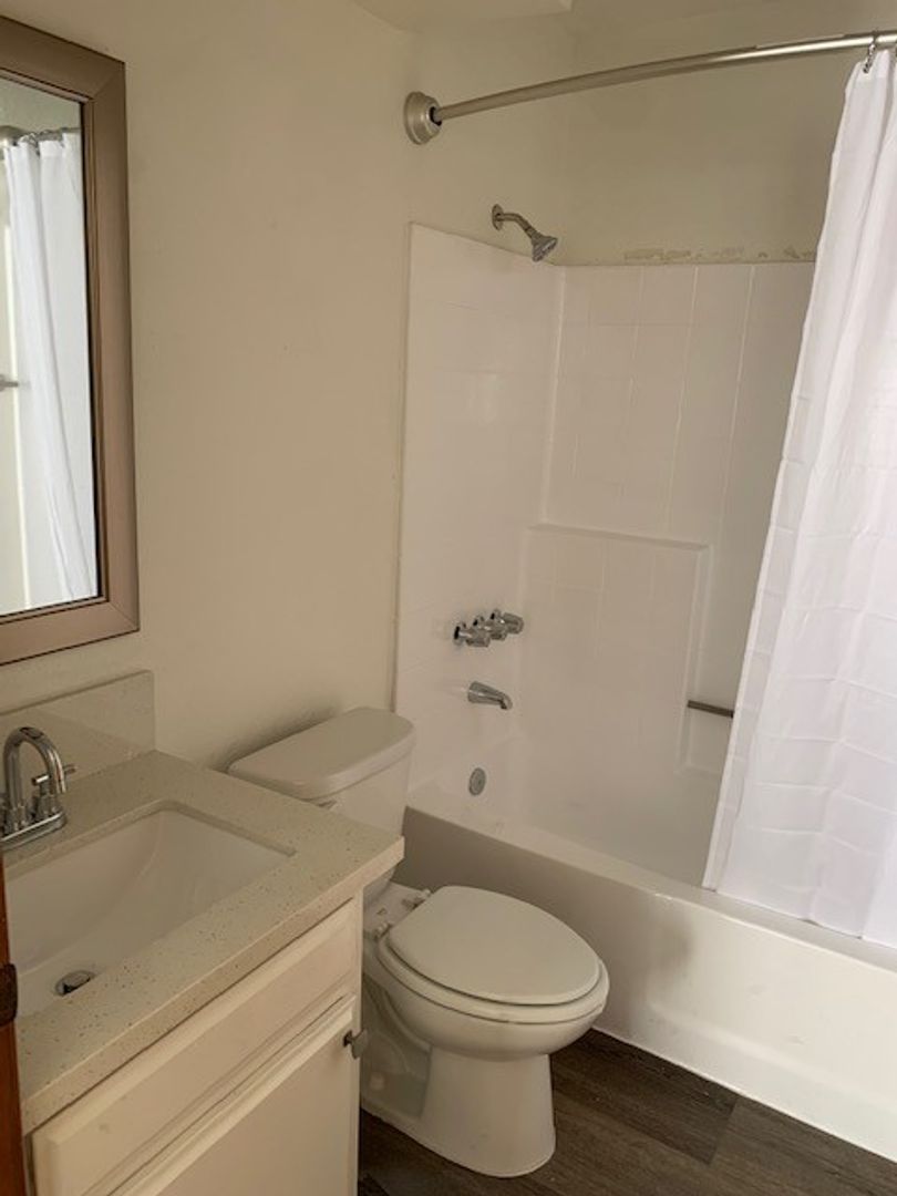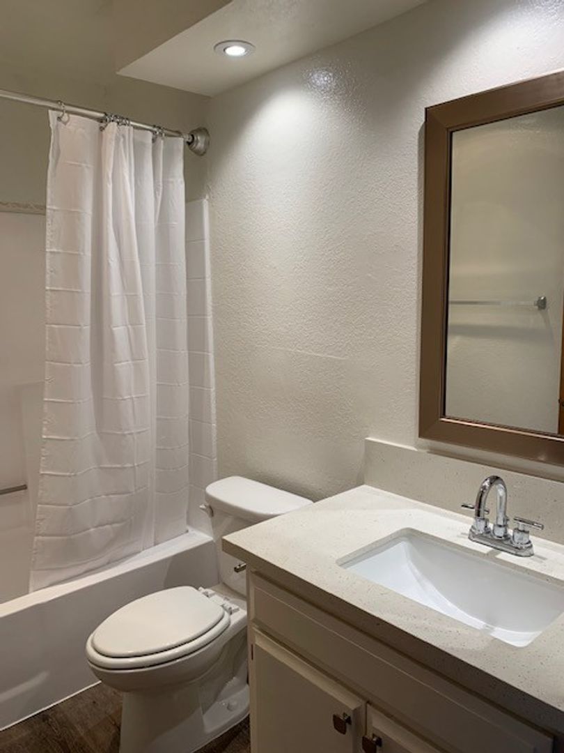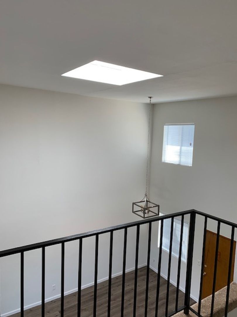 This spacious upstairs unit is flooded with natural light. It is approximately 1500 sq. feet, has four bedrooms, three bathrooms, a large living room with a 20-foot ceiling with skylight, a gas log fireplace, and a private balcony. There is laminate flooring on the first floor and carpet on the stairs and upper level. The kitchen features stone counters, stainless steel appliances, a contemporary light fixture, and adjacent space for your dining table. The remainder of the first floor has a master suite with an attached full bathroom, and another large bedroom with mirrored closet doors. Another full bathroom is located in the hall across from the stack washer & gas dryer in its own closet.