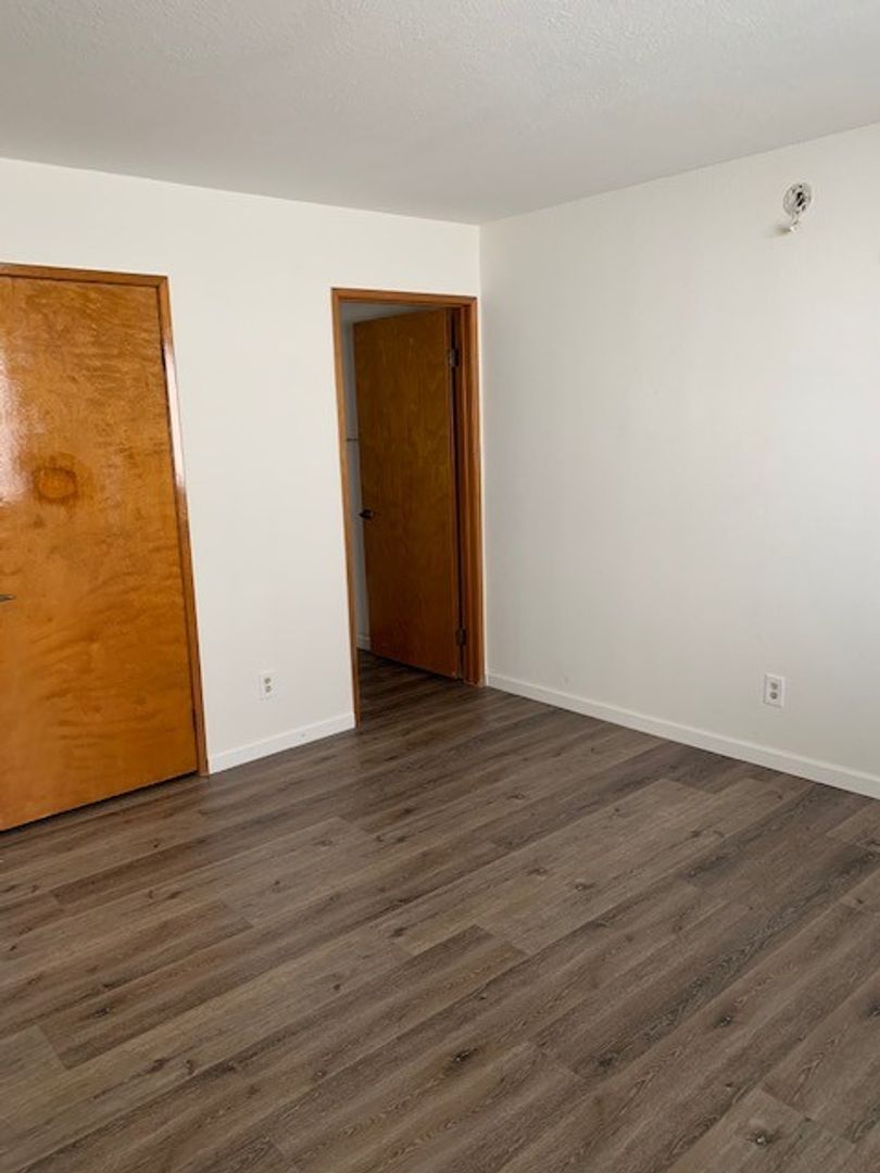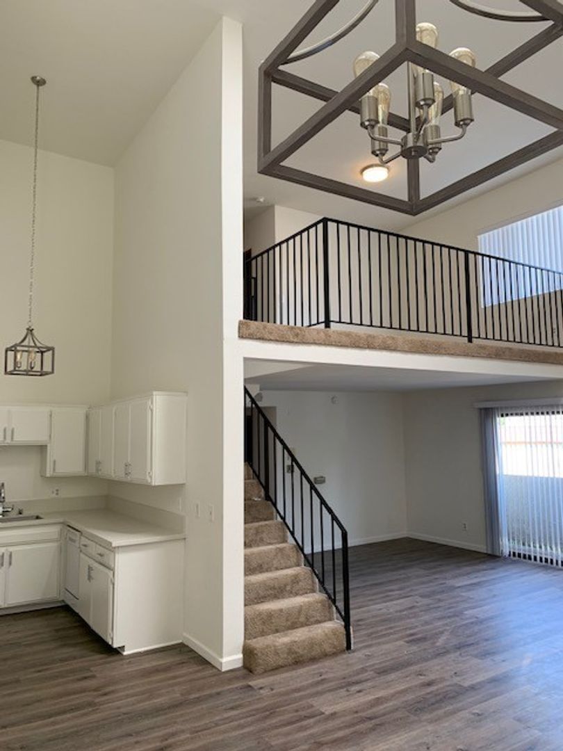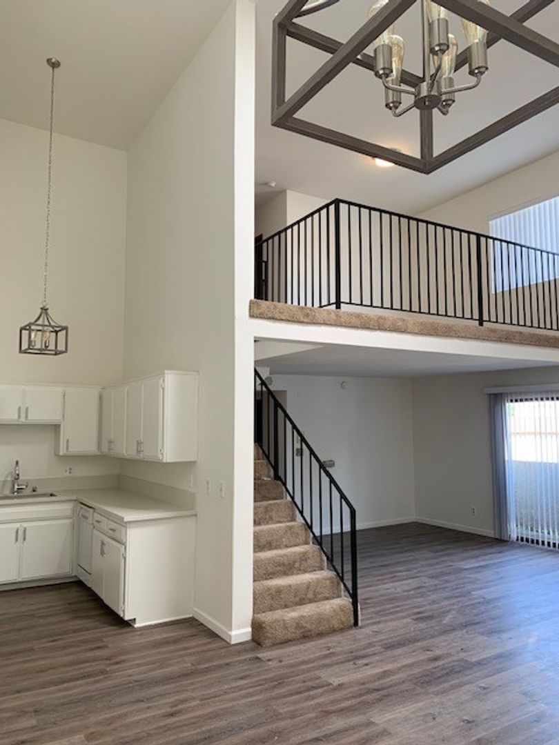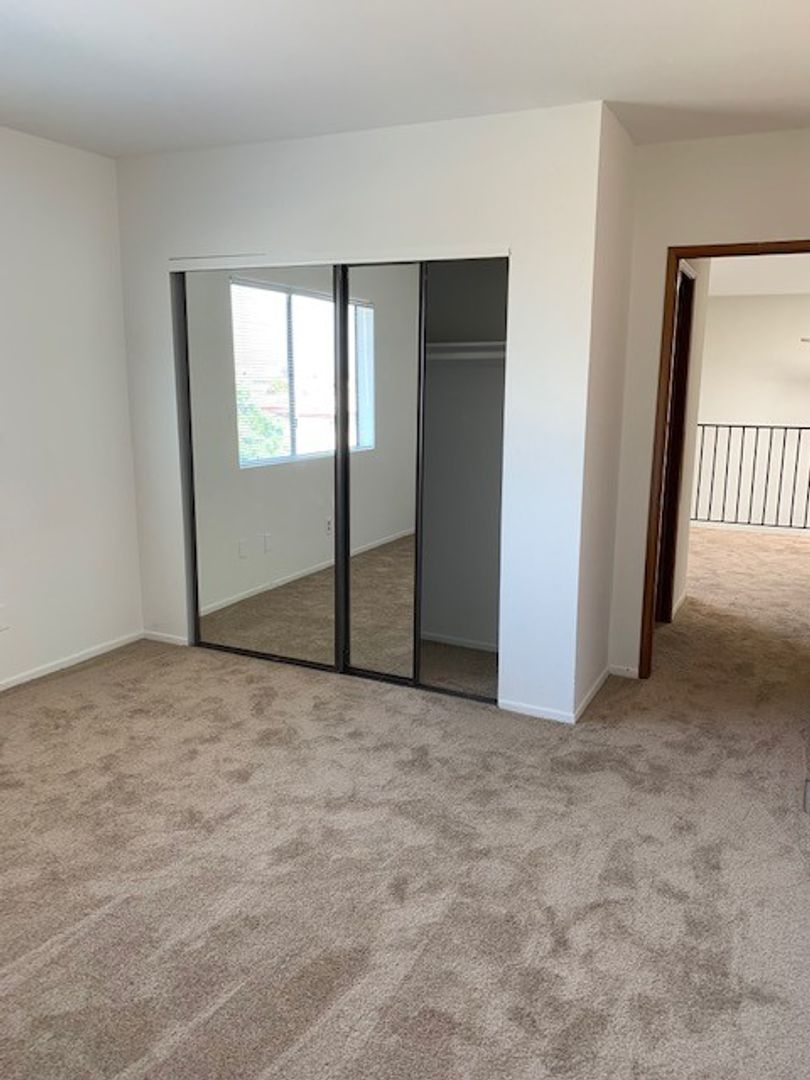 The second level has a separate loft space, which is suitable for another living space, den, or home office that's brightened by a window and skylight in the ceiling. The bedrooms are huge and have large mirrored closets and a shared full bathroom.